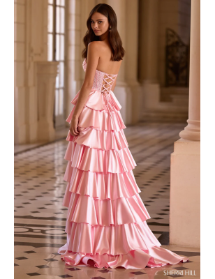 Abito senza spalline con corpetto in pizzo e gonna a balze in raso elasticizzato con spacco.