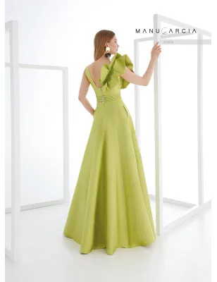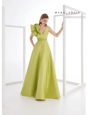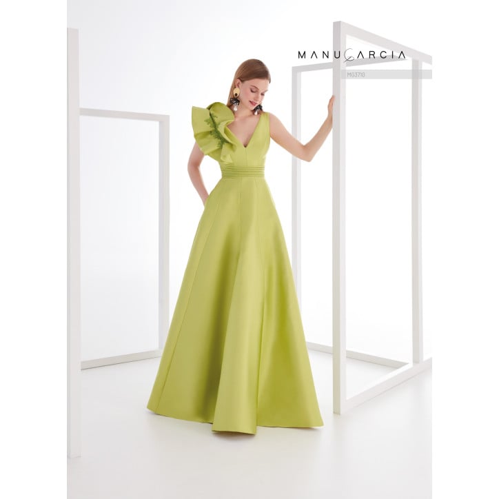Abito da festa piqué sarà al centro dell'attenzione. Il corpetto presenta una scollatura a V e una schiena aperta. Una spalla è ornata da una volant arricciata che scorre dalla scollatura anteriore a quella posteriore ed è impreziosita da applicazioni ricamate. La vita è stretta con una fascia in sbieco e a punta parigina nello stesso tessuto, fissata con bottoni di cristallo, lasciando il posto a una gonna svasata lusinghiera in silhouette a trapezio.