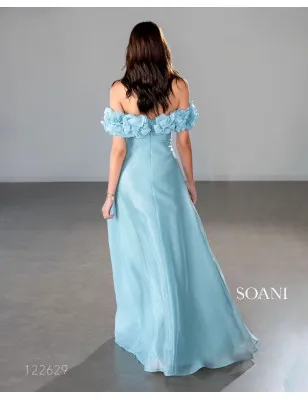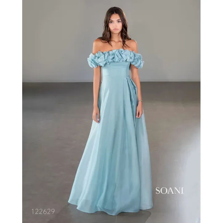 Abito lungo in tessuto leggero e fluido, con corpino a spalle scoperte e balza di rouches staccabile che dona movimento e romanticismo. Vita segnata e gonna ampia, per un’eleganza sofisticata e senza tempo, perfetta per cerimonie o eventi serali. Ideale per chi desidera un look che combina eleganza senza tempo con dettagli moderni e glamour.