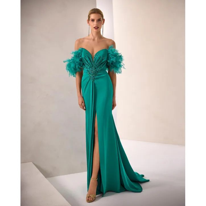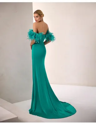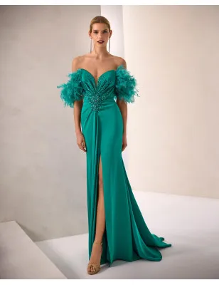 Abito da sera lungo. Realizzato in crêpe satin. Scollo a cuore e spalline cadenti. Dettagli con perline.