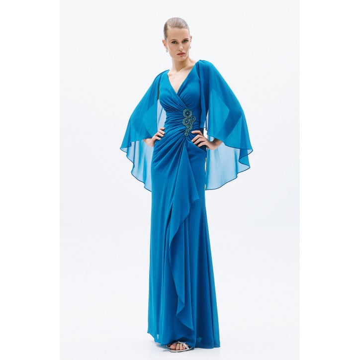 Bonini Privée - Abito lungo in chiffon con scollo a V profondo e spilla