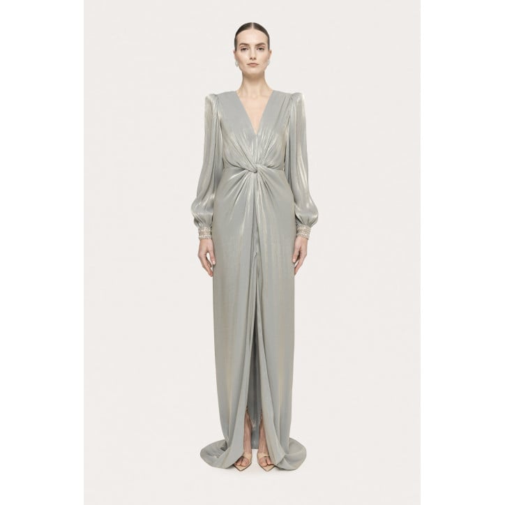Abito lungo in chiffon con dettaglio a torsione lunghezza massima fessura frontale prodotto realizzato in chiffon a maniche lunghe scollatura a V profonda dettaglio del treno maniche speciali del vescovo chiusura con cerniera dettaglio del cristallo sfaccettato. Modello: taglia regolare Tessuto: 100% POLIESTERE FODERA: 100% POLIESTERE