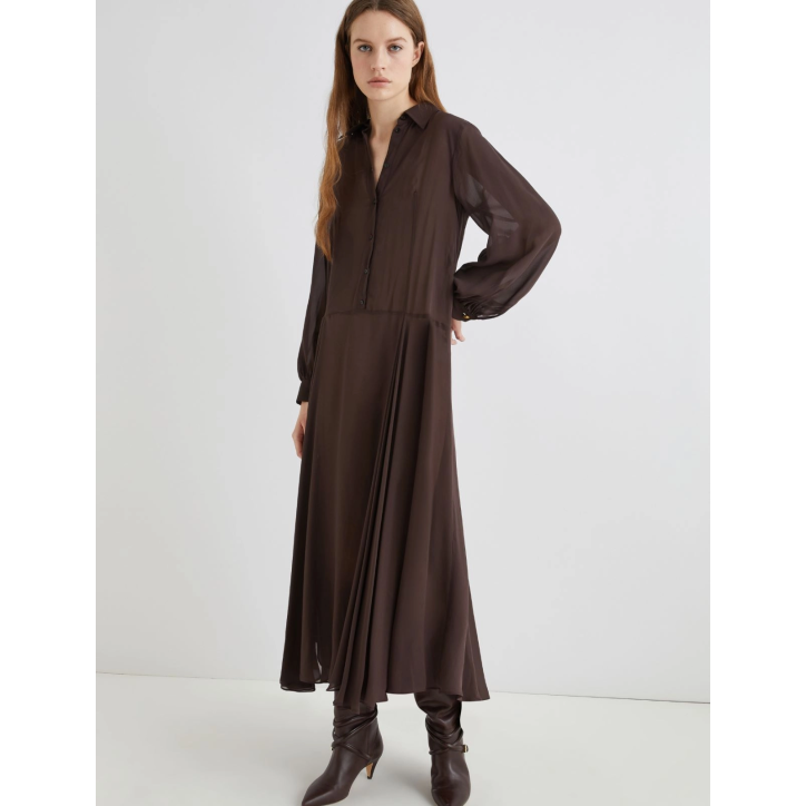 L'eleganza intramontabile dello chemisier, con il tocco sofisticato della georgette: impossibile resistere a questo nuovo abito, con maniche vaporose e taglio in vita per un effetto svasato sulla gonna. Tessuto principale contenente materie prime derivanti dalla cellulosa del legno, fibra ricavata nel rispetto del patrimonio forestale. Chemisier in georgette di viscosa, con sottoveste on tone. Fit regolare. Collo a camicia, con abbottonatura a polo. Sbuffo sul polso. Taglio in vita con pieghe che rendono ampia la gonna. Capo completato da sottoveste on tone.