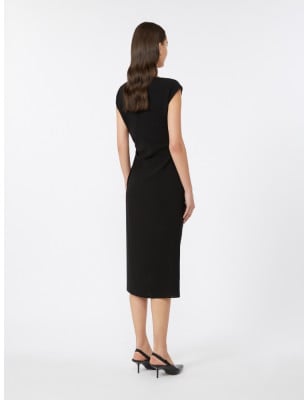 Abito midi con gonna pareo a vita alta e volant asimmetrico sul davanti. Abito in cady leggero Silhouette aderente e femminile Scollo a barchetta e piccole maniche corte a kimono Chiusura con zip laterale Motivo di pieghe sciolte sul bustino Drappeggio sul fianco sinistro Foderato. Abito Tessuto: 73% Triacetato, 27% Poliestere Fodera: 70% Acetato, 30% Poliestere