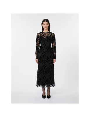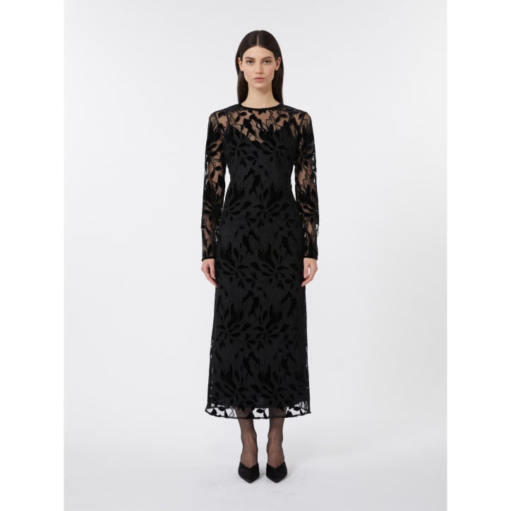 Abito lungo caratterizzato da una silhouette aderente e femminile. Abito in leggero tulle trasparente con ricamo floreale in velluto Girocollo e maniche lunghe a guanto Chiusura con lampo sul retro Sottoveste slipdress abbinata. Abito Tessuto: 100% Poliestere Filo ricamo: 100% Poliestere Decorazioni: 93% Poliestere, 7% Elastan SOTTOVESTE Tessuto a maglia: 100% Poliestere