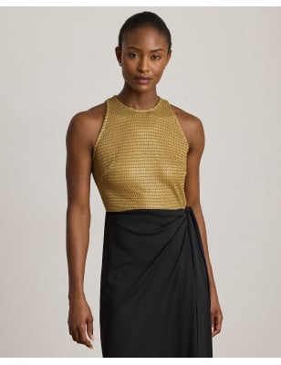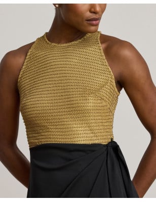 Perfetto per arricchire il guardaroba dei capi da sera, questo abito lungo unisce un corpino in rete con perline in tonalità oro a una gonna a portafoglio in jersey.Silhouette dritta. Lunghezza fino ai piedi. La taglia IT 44 ha una lunghezza di 153,7 cm. La lunghezza dell'abito è misurata a partire dal centro della nuca e varia di 1,3 cm in base alla taglia. Scollo arrotondato. Cerniera posteriore centrale nascosta con chiusura a gancetto. Silhouette senza maniche. Corpino con ricamo di perline all over. Gonna sovrapposta a portafoglio con fiocco sul lato sinistro della vita. Pieghe sul busto. Corpino foderato. Questo prodotto è realizzato con poliestere riciclato. Esterno del corpino: 100% poliestere. Esterno della gonna: 60% poliestere (riciclato), 35% poliestere, 5% elastan. Fodera: 89% poliestere, 11% elastan. Lavare a mano.