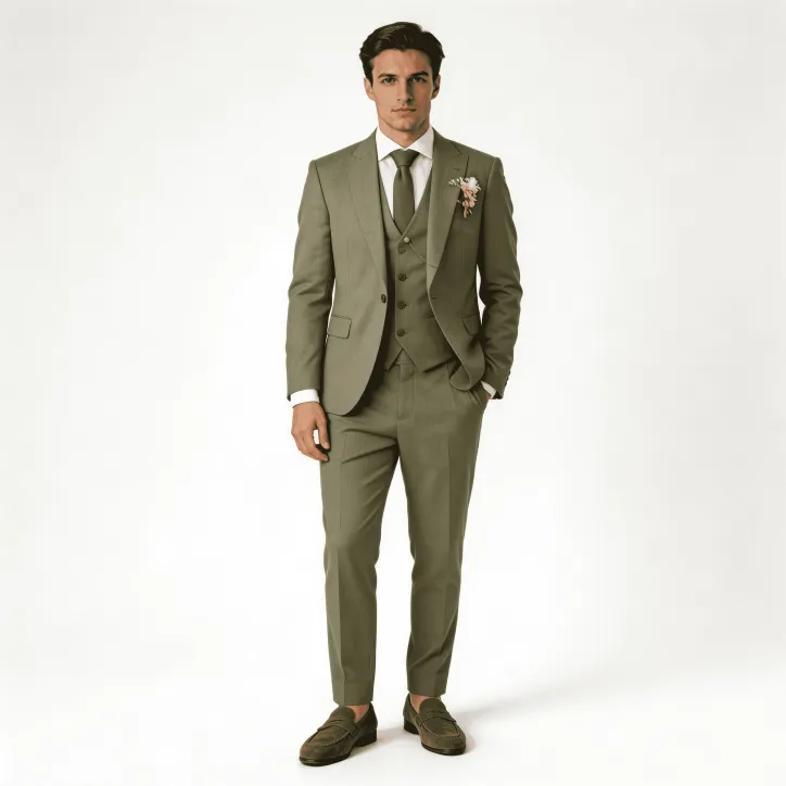 Volete davvero evitare di passare inosservati? Abito sartoriale monopetto con con rever a lancia a un bottone completato da un gilet monopetto. Perfetto per un gentiluomo moderno seguendo uno stile aggiornato e attuale. Tagliato su un tessuto morbido e senza tempo in una tonalità legnosa di color pino marittimo siciliano. Da accompagnare ad accessori - scarpe e cintura- camoscio color caffè. Noi personalmente non sappiamo dire di no al fascino intramontabile della cravatta sottile abbinata alla pochette ton sur ton. Ideale sia per un aperitivo al tramonto sia per un matrimonio non convenzionale.