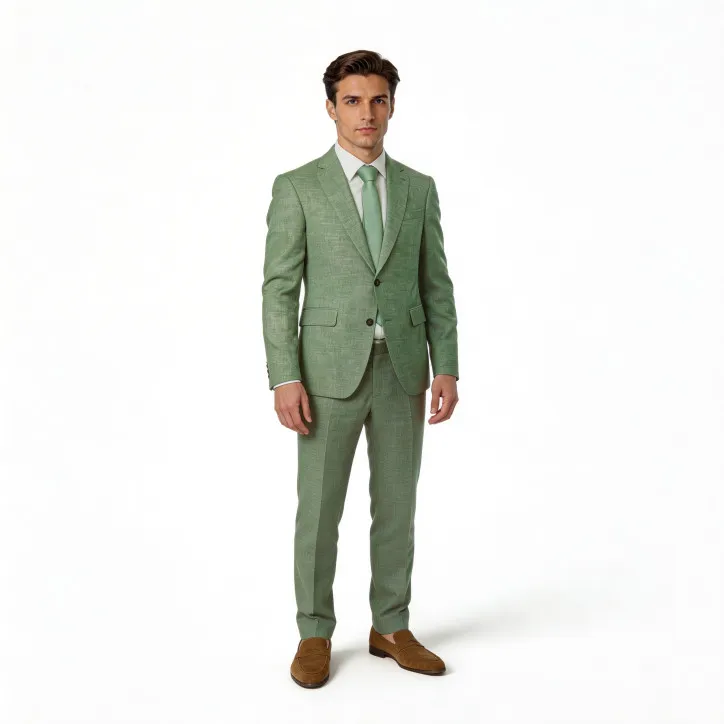 Volete davvero evitare di passare inosservati? Abito sartoriale monopetto con con rever a specchio a due bottoni. Perfetto per un gentiluomo moderno seguendo uno stile aggiornato e attuale. Tagliato su un tessuto fresco e confortevole in una tonalità che ricorda la menta bagnata. Da accompagnare ad accessori - scarpe e cintura- camoscio color brown. Noi personalmente non sappiamo dire di no al fascino intramontabile della cravatta sottile abbinata alla pochette ton sur ton. Ideale per una giornata lavorativa non convenzionale o un aperitivo in compagnia.