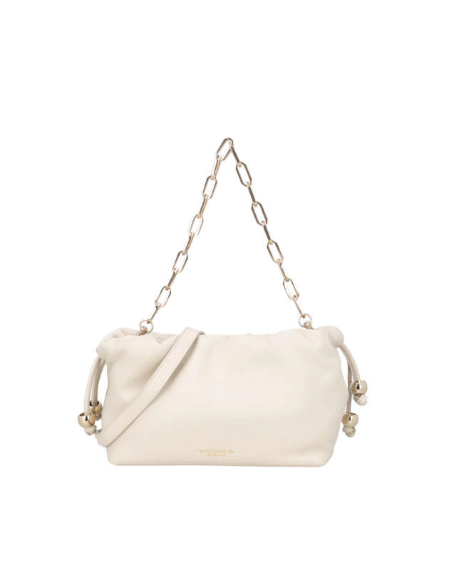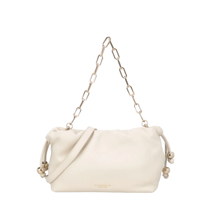 Pratica e contemporanea, questa pochette in pelle è l’accessorio trendy che completa ogni tuo look. La morbida pelle color avorio è impreziosita dalla placchetta logata applicata frontalmente. Il modello, caratterizzato da un unico ampio scomparto, presenta una pratica chiusura con calamita nascosta. I laccetti laterali arricchiti da perle metallizzate, aggiungono un tocco dinamico e moderno, mentre la doppia tracolla intercambiabile permette di passare da un mood sportivo ad uno chic in un istante. Eleva il tuo stile con la pochette in pelle firmata Tosca Blu. Altezza: 24 Larghezza: 15 Profondita: 11.5 100% PELLE