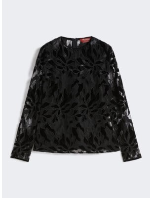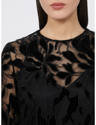 T-shirt dalla costruzione raffinata, che abbina la leggerezza del tulle alla texture dei ricami in velluto all over, per un effetto sofisticato e di classe. T-shirt in tulle leggero e trasparente Silhouette femminile con vestibilità aderente Girocollo Maniche lunghe a giro Chiusura con lampo sul retro Top sottoveste abbinato. BLUSA Tessuto: 100% Poliestere Filo ricamo: 100% Poliestere Decorazioni: 93% Poliestere, 7% Elastan TOP Tessuto a maglia: 100% Poliestere
