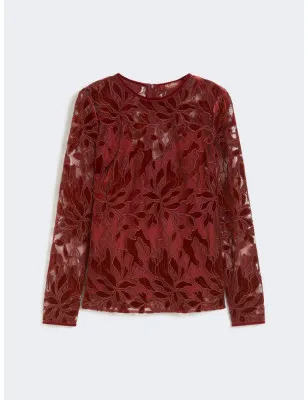 T-shirt dalla costruzione raffinata, che abbina la leggerezza del tulle alla texture dei ricami in velluto all over, per un effetto sofisticato e di classe. T-shirt in tulle leggero e trasparente Silhouette femminile con vestibilità aderente Girocollo Maniche lunghe a giro Chiusura con lampo sul retro Top sottoveste abbinato. BLUSA Tessuto: 100% Poliestere Filo ricamo: 100% Poliestere Decorazioni: 93% Poliestere, 7% Elastan TOP Tessuto a maglia: 100% Poliestere