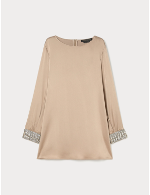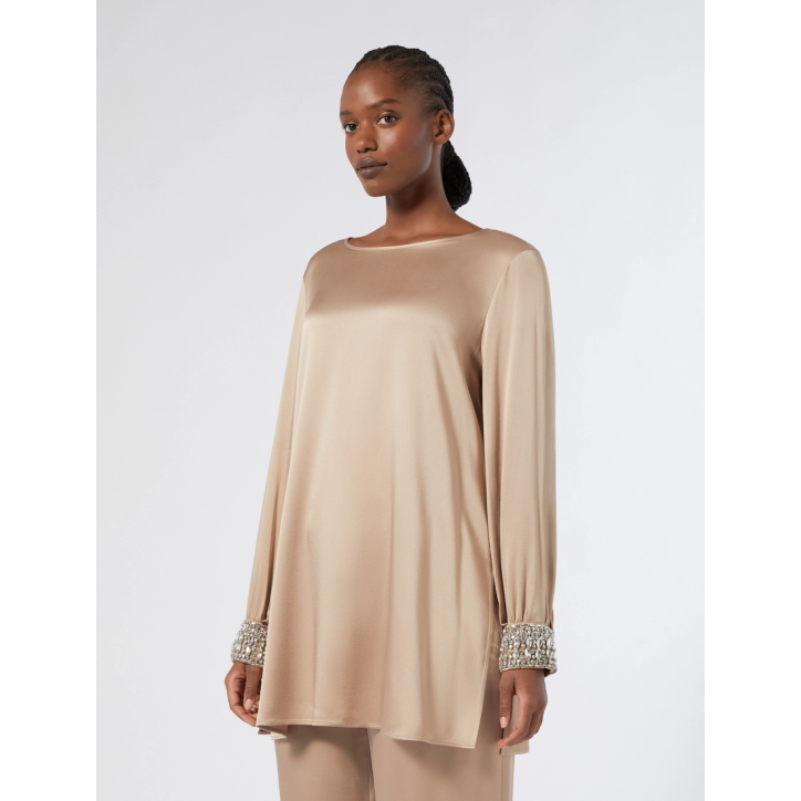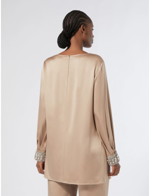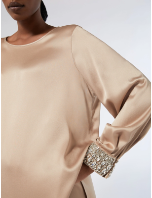 Eleganza essenziale per la blusa in crêpe envers satin lucido con maniche a camicia e polsi alti ricamati a mano da castoni in vetro. Li puoi abbinare ai pantaloni in coordinato. Il capo fa parte della collezione Elegante. Crêpe envers satin lucido Linea dritta Ricamo a mano con castoni in vetro Collo tondo Spacchi combaciati ai fianchi Chiusura con zip invisibile sul retro. BLUSA Tessuto 73% Acetato, 27% Viscosa - Decorazioni escluse