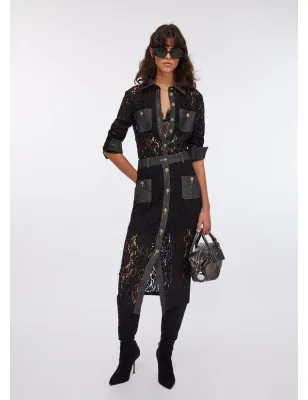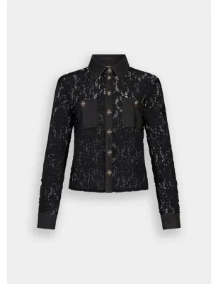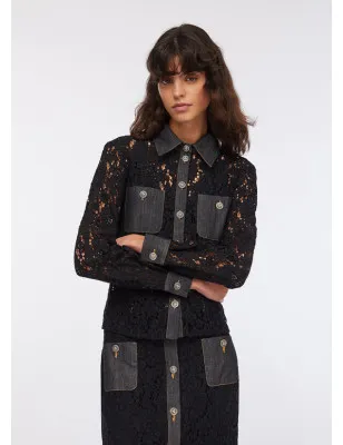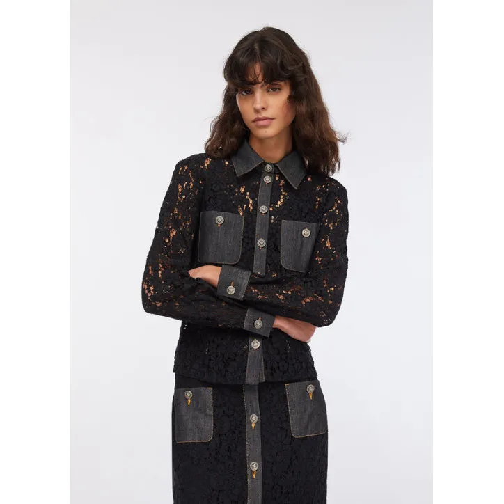Camicia in pizzo con dettagli in denim. Colletto classico. Maniche lunghe. Taschini con bottone. Logo in metallo sul retro. Chiusura con bottoni. Composizione: Tessuto principale: 50% Cotone, 40% Lyocell, 10% Modal| Tessuto secondario: 55% Cotone, 27% Poliammide, 18% Viscosa LAVAGGIO: Lavare a mano | Non trattare con cloro | Lavare delicatamente a secco con tetracloroetilene | Lavare a rovescio | Lavare separatamente ASCIUGATURA: Non usare Asciugatrice STIRAGGIO: Stirare a temperatura massima 110 °C | Stirare interponendo un panno.