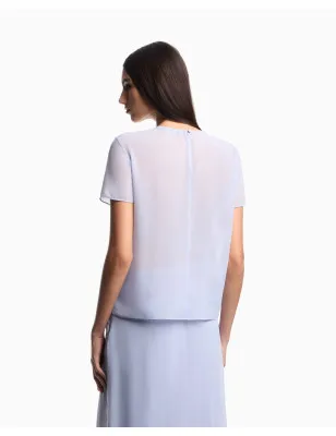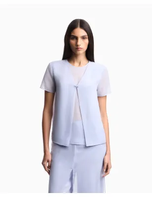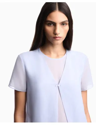 Blusa con costruzione ad effetto due pezzi, con scollo a V fissato da bottone fisso frontale, realizzata in tecno georgette. Grazie alla naturale leggerezza del tessuto il capo acquista femminilità e vaporosità, mentre la naturale trasparenza ne esalta la raffinata sensualità. Composizione: Tessuto: 100% poliestere. Fodera: 100% poliestere. Dettagli: Tecno georgette. Effetto 2 pezzi. Scollo V sopra girocollo. Maniche corte. Chiusura ad ogiva con bottone sul retro.