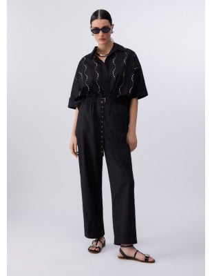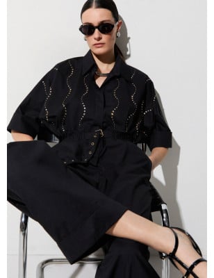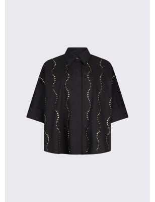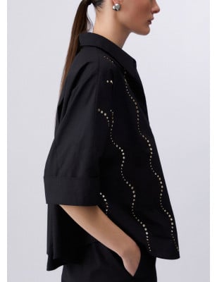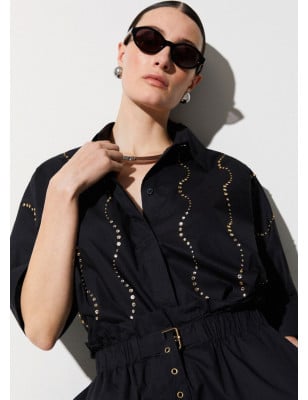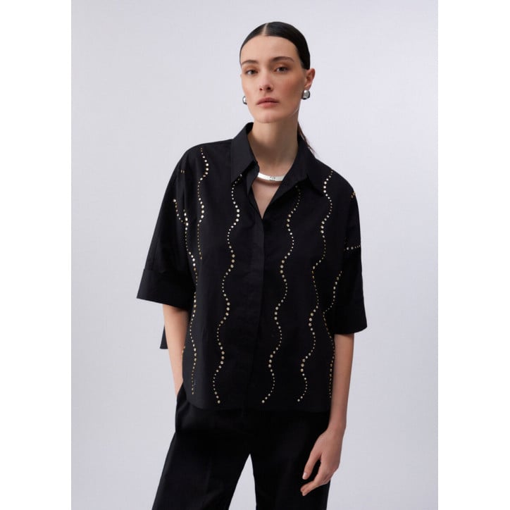 Questa camicia ha un’eleganza asciutta, quasi grafica, alleggerita da un taglio morbido e contemporaneo. I ricami gioiello tracciano una luminosità vivace e disinvolta, da indossare come protagonista su denim o pantaloni flare. Camicia in popeline strutturato Applicazioni gioiello Chiusura con bottoni nascosti Taglio ampio leggermente oversize. Composizione: Tessuto principale: 100% Cotone LAVAGGIO: Lavare delicatamente max 30°C | Non trattare con cloro | Lavare delicatamente a secco con tetracloroetilene | Lavare a rovescio | ASCIUGATURA: Non usare Asciugatrice | STIRAGGIO: Non stirare | Stirare a temperatura massima 110 °C | Non stirare le decorazioni.