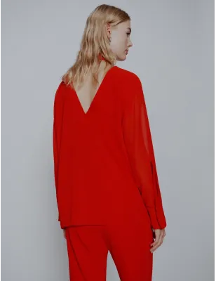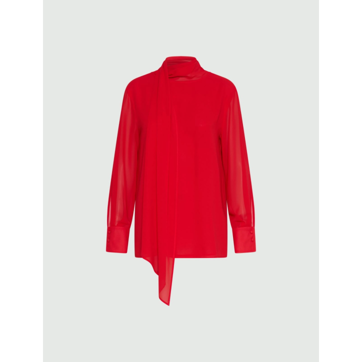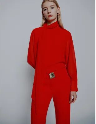Alternativa cool alla camicia, questa blusa in georgette crêpe scende fluida lungo il busto e gioca con il tocco romantico della sciarpina al collo. Sul retro, lo scollo a V che sorprende con la sua sensualità. Tessuto principale contenente una percentuale di poliestere riciclato superiore al 50% Blusa in georgette crêpe Fit regolare Collo leggermente rialzato con sciarpina da annodare Manica lunga con leggero sbuffo alla spalla Scollo posteriore a V. Composizione 100% poliestere. Lavaggio In lavatrice max 30 gradi ridotta azione meccanica; non candeggiare; non asciugare in tamburo; asciugare appeso in ombra; ferro tiepido max 120 gradi c; lavare a secco delicato con percloroetilene.