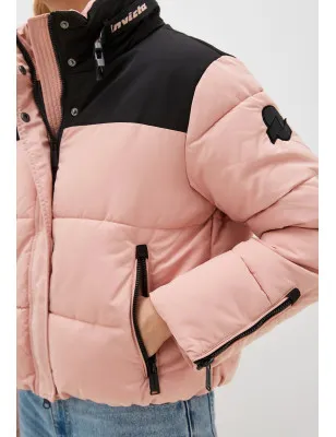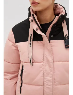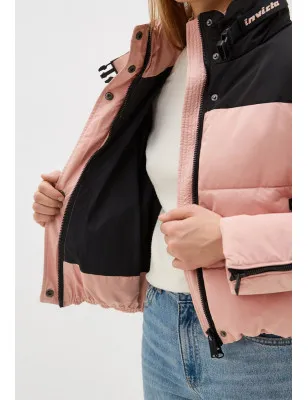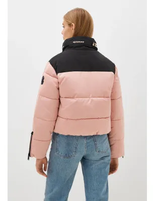 Giubbino corto donna senza cappuccio. Carrè e collo in tessuto polycotone. Allacciatura centro davanti con lampo, coperta da finta con bottoni a pressione testa nascosta. Al collo nastro bicolore personalizzato amovibile chiuso con fibbia. Fodera liscio, fondo con elasticatura interna; polsi regolabili con zip. Bretelle staccabili personalizzate all'interno del capo, che permettono di indossare il capo come se fosse uno zaino.