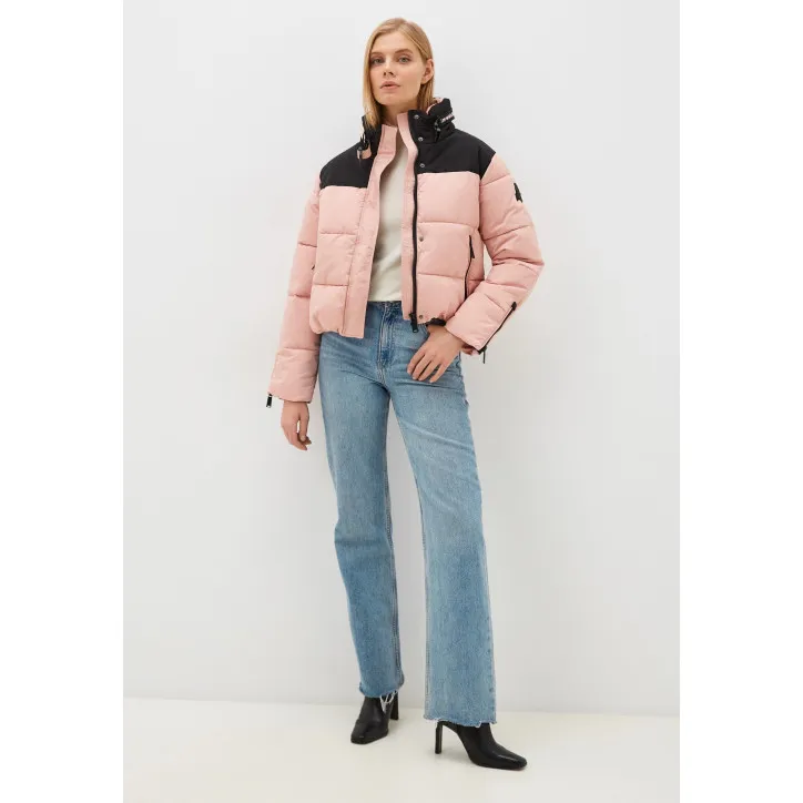 Giubbino corto donna senza cappuccio. Carrè e collo in tessuto polycotone. Allacciatura centro davanti con lampo, coperta da finta con bottoni a pressione testa nascosta. Al collo nastro bicolore personalizzato amovibile chiuso con fibbia. Fodera liscio, fondo con elasticatura interna; polsi regolabili con zip. Bretelle staccabili personalizzate all'interno del capo, che permettono di indossare il capo come se fosse uno zaino.