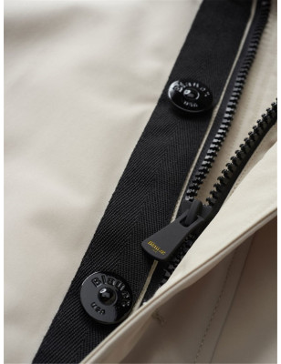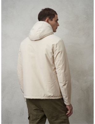 Giacca liscia in neoprene imbottita e foderata internamente in nylon in tono con impuntura a onde orizzontale. Cappuccio fisso con pattina e tre bottoni a chiodo di chiusura davanti. Chiusura centrale con zip doppio cursore nascosta da pattina con bottoni a chiodo marchiati Blauer. Caratteristico passante Blauer in tono cucito sul petto a sinistra e patch Blauer sulla manica sinistra.