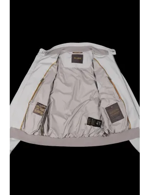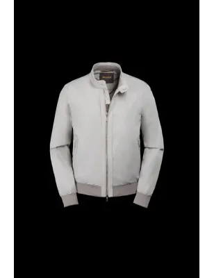 Bomber della linea Acqua ,realizzato in tessuto elastico resinato idrorepellente, molto compatto e resistente alla trazione. Collo a fascetta con bottone a pressione e maglia rasata interna Chiusura frontale con zip in metallo doppio cursore Tasche esterne con chiusura a zip e contornate da motivo in tessuto sagomato Bordi su polsi e fondi manica in maglia Foderato internamente con tasche porta documenti Made in Italy. DISPONIBILE SOLO NELLE VARIANTI GHIACCIO E DARK BLUE.
