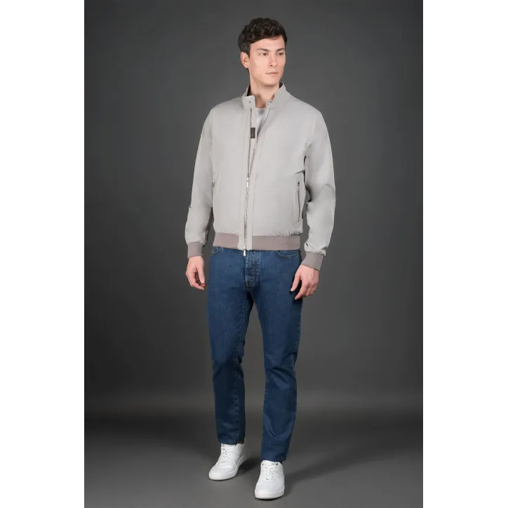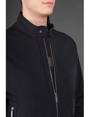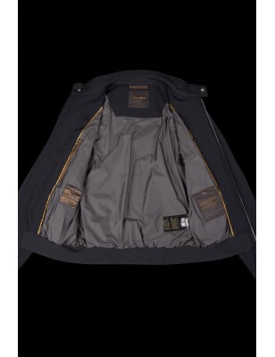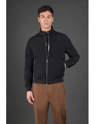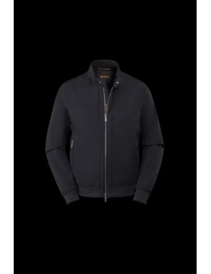 Bomber della linea Acqua ,realizzato in tessuto elastico resinato idrorepellente, molto compatto e resistente alla trazione. Collo a fascetta con bottone a pressione e maglia rasata interna Chiusura frontale con zip in metallo doppio cursore Tasche esterne con chiusura a zip e contornate da motivo in tessuto sagomato Bordi su polsi e fondi manica in maglia Foderato internamente con tasche porta documenti Made in Italy. DISPONIBILE SOLO NELLE VARIANTI GHIACCIO E DARK BLUE.