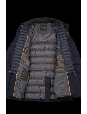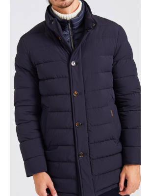 Cappotto monopetto dalla linea dritta trapuntato in piuma d’oca. Realizzato in tessuto bielastico idrorepellente, compatto e resistente alla trazione. Corpetto trapuntato staccabile, realizzato in tessuto down-proof, con dettaglio interno in maglia rasata Abbottonatura con asole e bottoni in corno Tasche laterali Internamente trapuntato sulla schiena Tasche interne porta valori