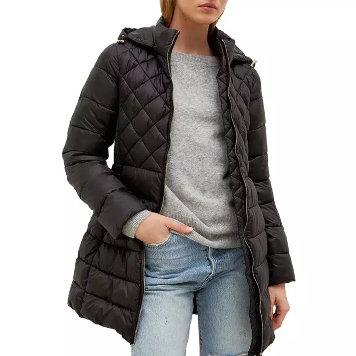 Collo alto con cappuccio e coulisse, tasche con zip sui fianchi.