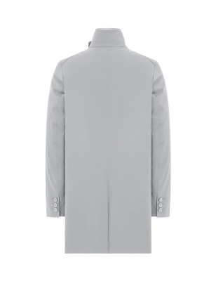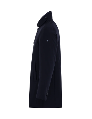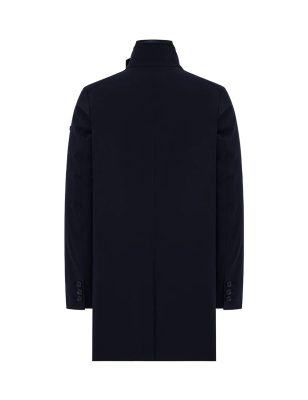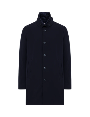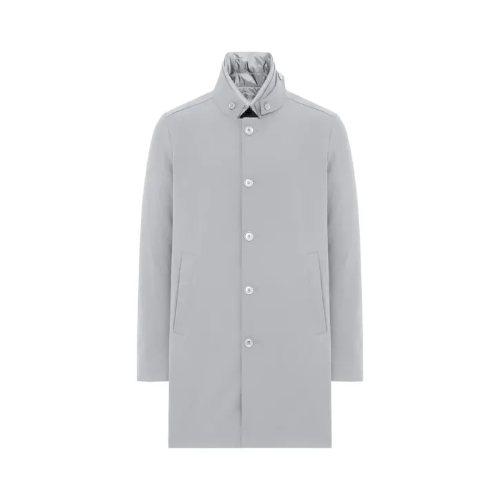 Cappotto in tessuto 2-Layer bi-stretch con imbottitura in piuma, chiusura frontale con bottoni e tasche laterali con filetto. Il capo è caratterizzato da pettorina staccabile con chiusura ad automatici, collo in piedi e dettaglio di laccio sottogola fissato con bottoni. Spacco centrale al fondo dietro con automatico nascosto e fondo manica con spacco e chiusura a tre bottoni. All'interno tasche multifunzione con dettagli catarifrangenti. CARATTERISTICHE DEL TESSUTO Tessuto tecnico 2-Layer in nylon bi-stretch wrinkle-free con microstruttura diagonale e membrana posteriore elastica waterproof con WP 5.000 mm e con traspirabilità pari a MVP 5.000 g/ sqm/24hrs. La morbidezza del tessuto bi-stretch conferisce comfort nel movimento, mentre I' imbottitura in piuma e la protezione offerta dalla membrana del tessuto agevolano la termoregolazione del corpo, preservando il microclima interno al capo. Composizione: 83% Poliammide 17% Elastan Imbottitura: 90% Piumino 10% Piuma VESTIBILITÀ Regular