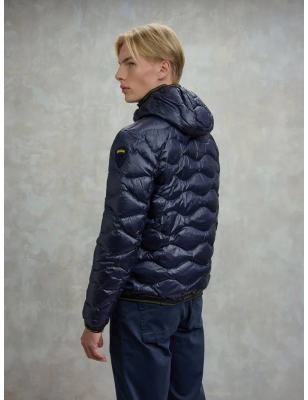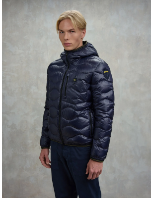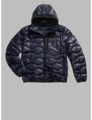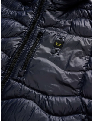 Piumino trapuntato ad onde orizzontali. Taschina applicata sul petto a sinistra per donare al capo iconico Blauer un tocco più funzionale. Imbottitura naturale in piuma, calda e non ingombrante; dedicato a chi vuole essere sempre alla moda in ogni occasione. • Cappuccio fisso • Foderato in tono • Imbottito piuma 90/10 gr.165 • Chiusura con zip • Copri cursore sul collo • Tasche con zip • Taschino con zip sul petto • Elastico rigato sul profilo del cappuccio, polsino e fondo. • Tasche interne doppie: aperte e con velcro • Patch e passante con logo.