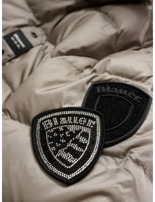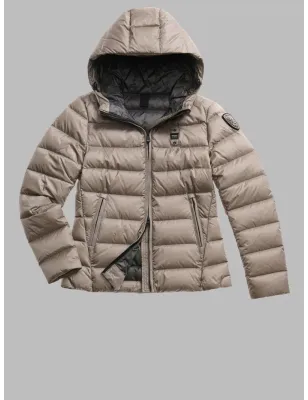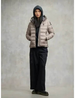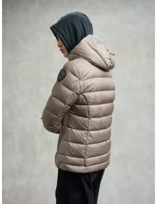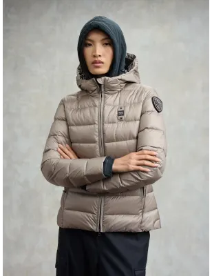 Piumino idrorepellente trapuntato a righe orizzontali. Capo con imbottitura leggera, calda e non ingombrante, dai colori fashion e dal taglio che risalta il punto vita. • Cappuccio fisso con coulisse • Realizzato in nylon lucido • Foderato in nylon contrasto colore • Imbottito piuma 90/10 gr.165 • Chiusura con zip nascosta • Copri cursore sul collo • Tasche con zip • Tasche interne con velcro e zip. • Coulisse sul fondo • Patch glitterato e passante con logo.