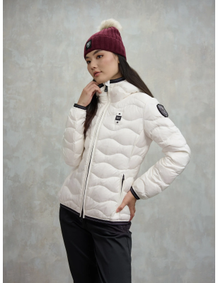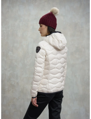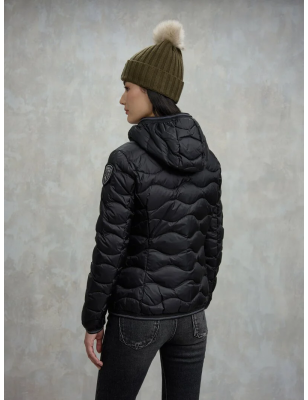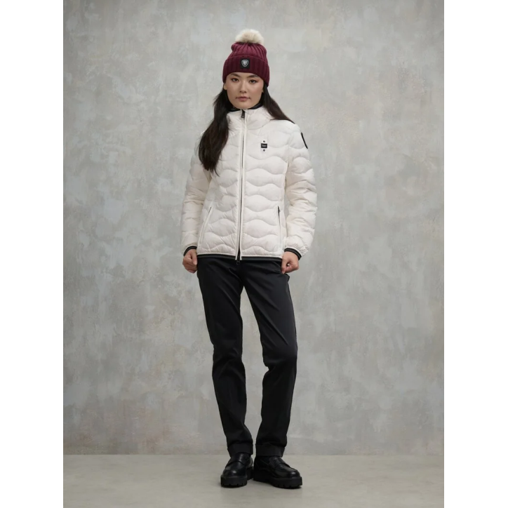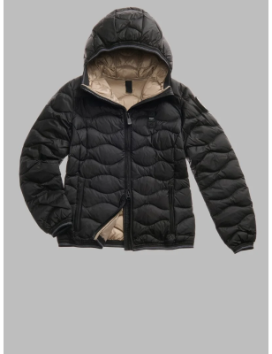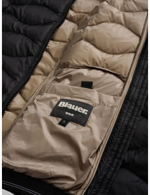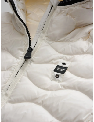 Piumino idrorepellente trapuntato ad onde orizzontali dal taglio svasato. Capo iconico Blauer con imbottitura naturale, calda e non ingombrante. • Cappuccio fisso con elastico rigato • Realizzato in nylon lucido • Foderato in nylon contrasto colore • Imbottito piuma 90/10 gr.150 • Chiusura con zip nascosta • Copri cursore sul collo • Tasche con zip • Elastico rigato sul fondo e sui polsini • Tasca interna con velcro • Patch con glitter e passante con logo.