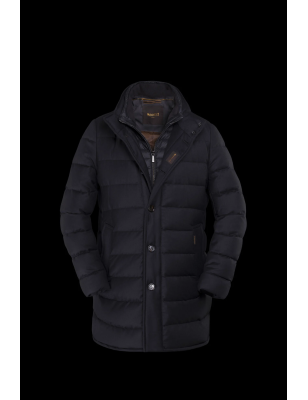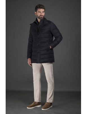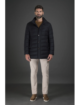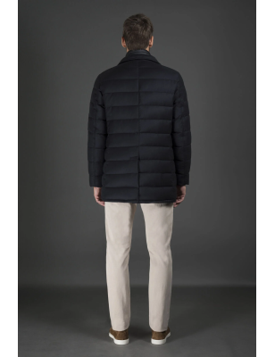 Cappotto monopetto dalla linea dritta, imbottito in piuma d'oca e trapuntato a boudin. Realizzato in finissima flanella in puro cashmere, tinto in filo. Flanella di puro cashmere Corpetto trapuntato staccabile, realizzato in tessuto down-proof, con dettaglio interno in maglia rasata Bottoni a pressione sul collo Chiusura frontale con asole e bottoni in corno Tasche laterali a filetto Spacco posteriore chiuso da bottoni a pressione Internamente trapuntato sulla schiena Pratiche tasche interne porta valori