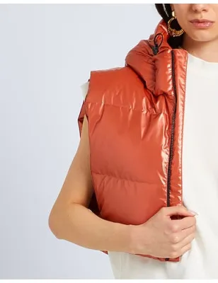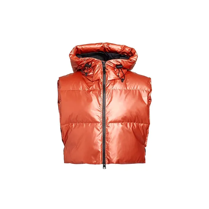 imbottito corto, tessuto tecnico, trapuntato, metallizzato, tinta unita, senza applicazioni, collo con cappuccio, monopetto, senza maniche, imbottitura sintetica, chiusura con zip, senza tasche, non lavare a secco, non candeggiare, asciugare in asciugatrice