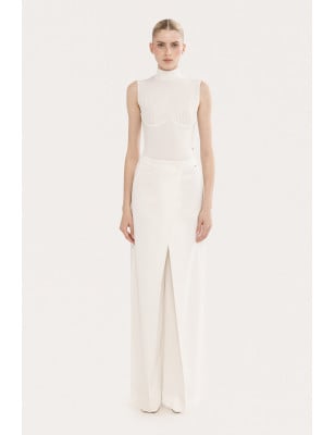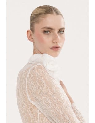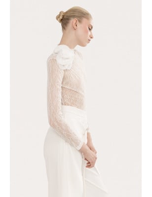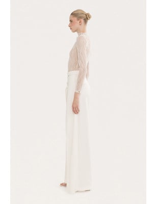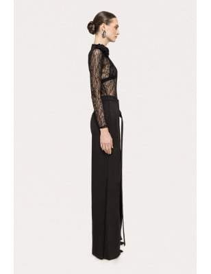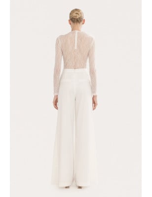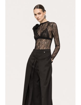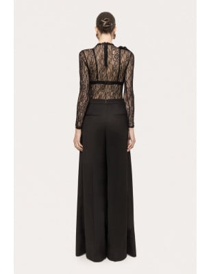 pantaloni a vita alta, pantaloni a gamba larga, Vita alta, Chiusura con un solo bottone sul davanti. Tasche laterali. Modello: taglia regolare Tessuto: 62% POLIESTERE, 35% VISCOSA, 3% SPANDEX; TASCHE: 100% ACETATO. Body in pizzo con dettagli floreali, dettagli in pizzo floreale, a maniche lunghe, collare alla base del collo, chiusura con cerniera