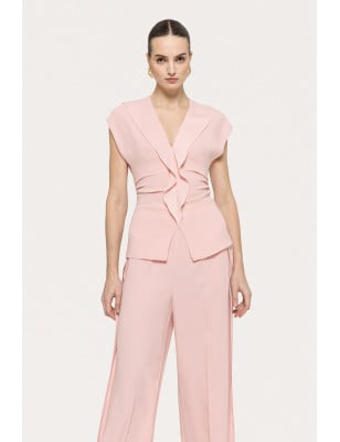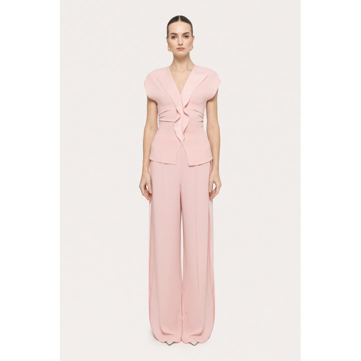 Top in crêpe con dettagli a volant trama crêpe a maniche corte scollatura a V profonda volant sul busto chiusura con cerniera. Pantaloni a vita alta e gamba larga pantaloni a gamba larga Vita alta chiusura con cerniera disponibile in vari colori trama crêpe. Modello: taglia regolare Tessuto: 100% POLIESTERE