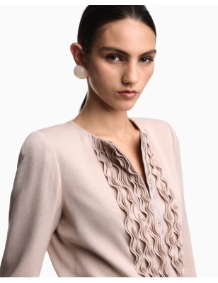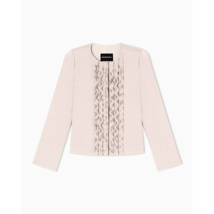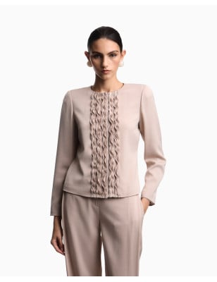 Giacca realizzata in fresco tessuto armarturato. Il modello è caratterizzato da dettaglio con nastri applicati che creano un ricercato effetto di touches dall'andamento verticale. Una silhouette moderna e raffinata, ideale per completare look ricercati e contemporanei. Un capo versatile che si adatta ad ogni occasione, dal giorno alla sera. Composizione: Tessuto: 100% viscosa Fodera: 95% poliestere, 5% elastan. Dettagli: Tessuto armaturato. Linea sfiancata. Scollo tondo. Chiusura con automatici nascosti. Dettaglio effetto rouches. Maniche lunghe. Fodera in saglia.