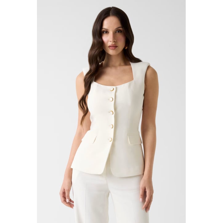 Gilet in misto viscosa. Senza maniche. Collo quadrato. Tasche a pattina. Chiusura con bottoni. SHELL (tessuto principale): 97% Viscosa / Rayon, 3% Spandex / Elastan; FODERA: 96% Poliestere, 4% Spandex / Elastan ETICHETTA DI LAVAGGIO: Lavare a mano in acqua fredda - processo delicato.