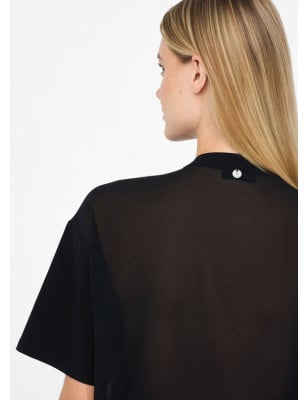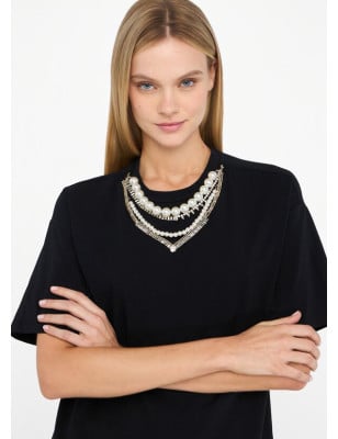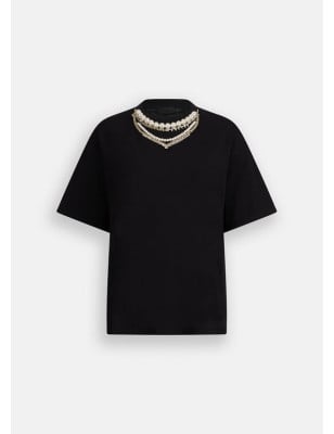T-shirt nera. Realizzata in jersey di cotone stretch e georgette. Collo con perle e strass. Maniche corte. Logo in metallo sul retro. Composizione: Tessuto principale: 95% Cotone, 5% Elastan| Tessuto secondario: 100% Poliestere LAVAGGIO: Lavare delicatamente max 30°C | Non trattare con cloro | Non Lavare a secco | Lavare a rovescio ASCIUGATURA: Non usare Asciugatrice STIRAGGIO: Non stirare | Stirare a temperatura massima 110 °C | Non stirare le decorazioni | Stirare interponendo un panno