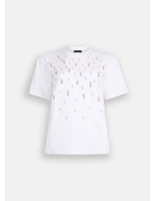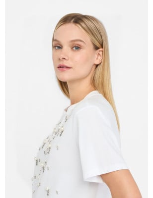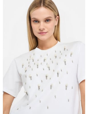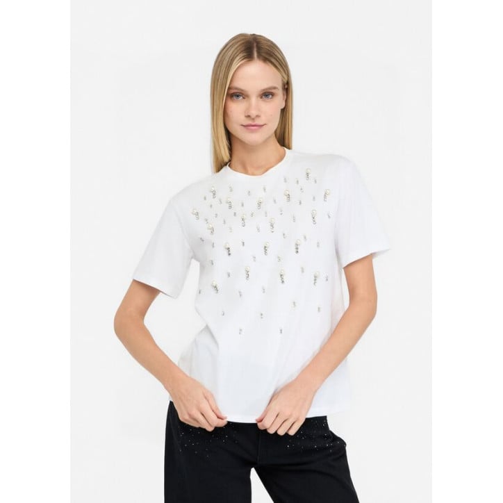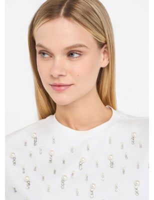 T-shirt bianca. Realizzata in jersey di cotone stretch. Perle e strass applicati. Taglio girocollo. Maniche corte. Logo in metallo sul retro. Prodotto "Liu Jo Better". Composizione: Tessuto principale: 95% Cotone, 5% Elastan LAVAGGIO: Lavare a mano | Non trattare con cloro | Non Lavare a secco | Lavare a rovescio | Non strofinare durante il lavaggio ASCIUGATURA: Non usare Asciugatrice STIRAGGIO: Non stirare | Stirare a temperatura massima 110 °C | Non stirare le decorazioni | Stirare interponendo un panno