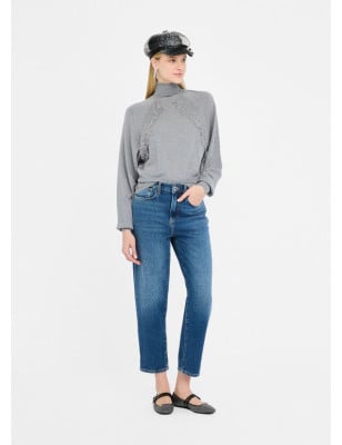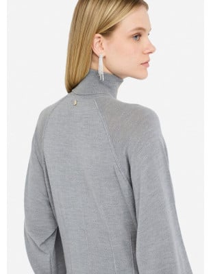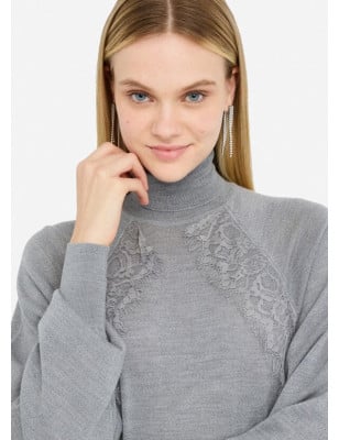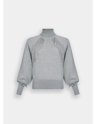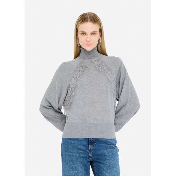 Dolcevita in lana grigia. Dettagli in pizzo. Maniche raglan a palloncino. Bordi a costine. Logo LJ in metallo con strass sul retro. Composizione: Tessuto principale: 100% Lana Vergine| Tessuto secondario: 100% Poliammide LAVAGGIO: Lavare a mano | Non trattare con cloro | Lavare delicatamente a secco con tetracloroetilene | Lavare a rovescio | Non strofinare durante il lavaggio ASCIUGATURA: Non usare Asciugatrice | Asciugare in piano STIRAGGIO: Stirare a temperatura massima 110 °C | Stirare interponendo un panno.