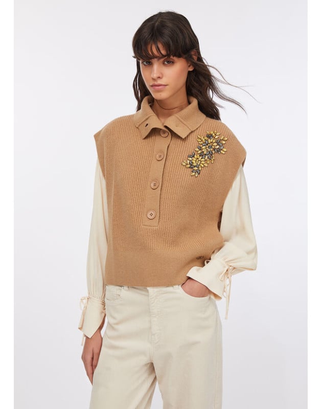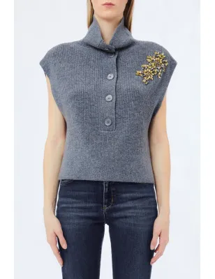 La purezza della lana 100% in un capo prezioso e scintillante: sceglilo su maxi gonne o jeans per un daily look dal tocco morbido e avvolgente. Gilet in maglia 100% lana Chiusura con bottoni Ricamo gioiello Spacchetti sui lati