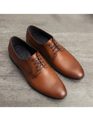 Scarpe stringate e allacciate Derby, in vera pelle, senza cuciture a vista sulla parte superiore della tomaia. Disponibili in diverse tonalità del marrone. Realizzata in pelle di vitello tinta a mano, dalla punta elegante e affussolata, in un chiaro richiamo old vintage. La calzata è regolare e confortevole. Un must da indossare sotto gli abiti per cerimonie formali o per occassioni speciali sotto un pantalone chinos.