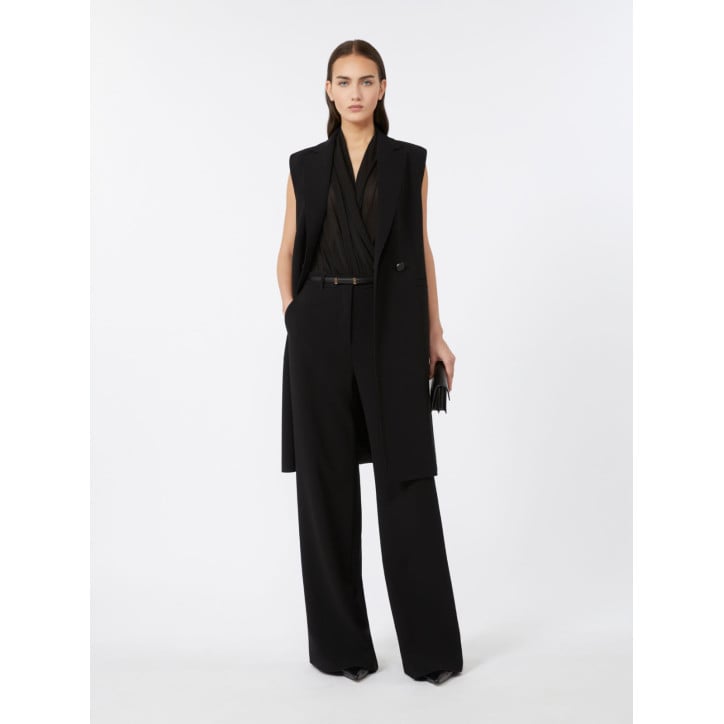 Pantalone dalla linea fluida con cintura abbinata in tessuto spalmato. Pantalone in cady Gamba larga Chiusura con listino alto in vita, zip con patta e gancetto Tasche alla francese sui fianchi Tasche a doppio filetto con bottone sul retro. PANTALONE Tessuto 71% Triacetato, 29% Poliestere Con cintura in Poliestere con spalmatura in poliuretano CINTURA