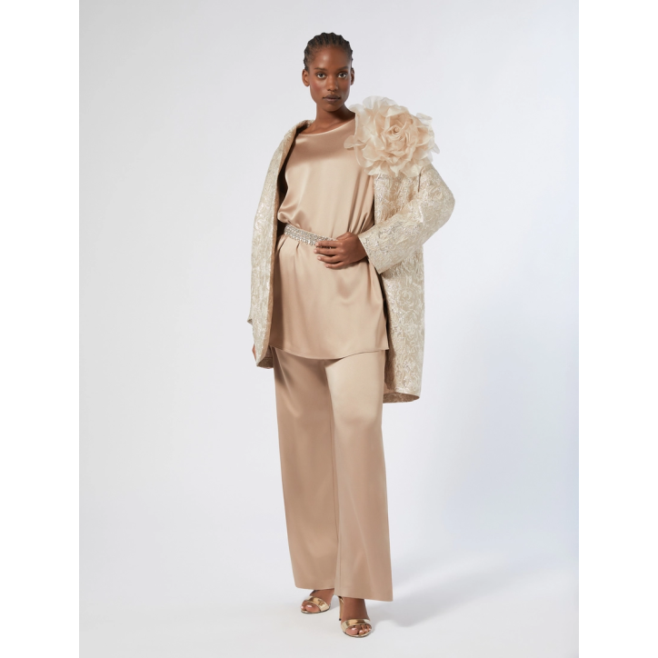 Look luminoso e prezioso con i pantaloni in envers satin lucido, dalla linea ampia con elastico in vita per un fit morbido e confortevole. Il capo fa parte della collezione Elegante. Envers satin Linea ampia Elastico in vita. PANTALONE Tessuto: 73% Acetato, 27% Viscosa