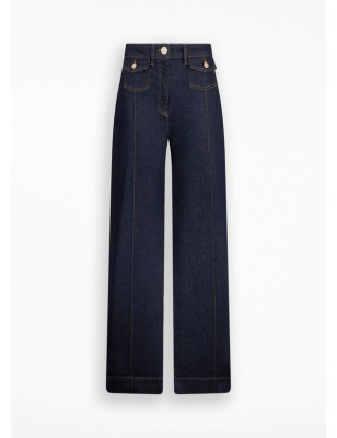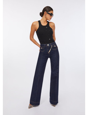 eans in denim di cotone stretch Vita alta Gamba flare Piega stirata Charm gioiello con nappine Tasche con patta sul davanti Tasche sul retro Chiusura con bottone e zip nascosta
