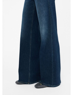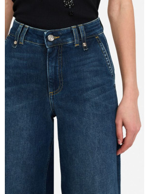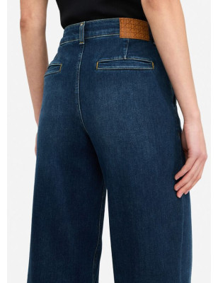 Jeans in denim di cotone stretch Lavaggio used e piega stirata Vita alta Gamba flare Tasche sui fianchi e sul retro Salpa logata Chiusura con bottone e zip coperta
