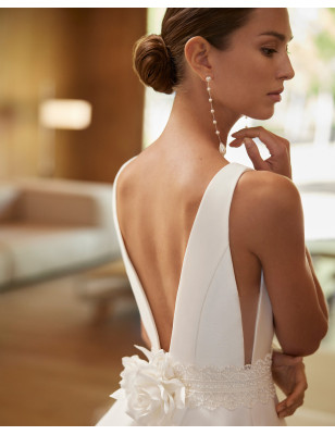La collezione di Rosa Clará si caratterizza per la sua eleganza e raffinatezza grazie ad abiti in crêpe con volant scultorei. Per aggiungere un tocco di romanticismo, il marchio combina fiori nello stesso tessuto di crêpe dell'abito con altri in organza, per creare composizioni delicate che decorano scollature e spalle.