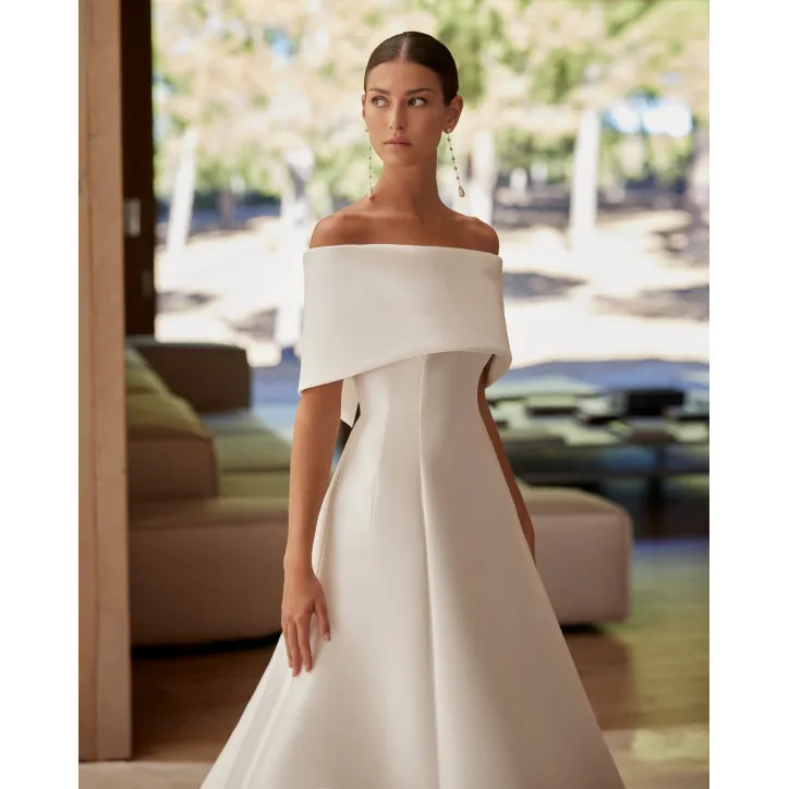 La collezione di Rosa Clará si caratterizza per la sua eleganza e raffinatezza grazie ad abiti in crêpe con volant scultorei. Per aggiungere un tocco di romanticismo, il marchio combina fiori nello stesso tessuto di crêpe dell'abito con altri in organza, per creare composizioni delicate che decorano scollature e spalle.