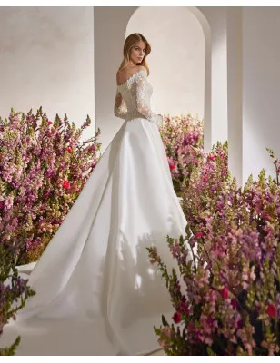 La collezione di Rosa Clará si caratterizza per la sua eleganza e raffinatezza grazie ad abiti in crêpe con volant scultorei. Per aggiungere un tocco di romanticismo, il marchio combina fiori nello stesso tessuto di crêpe dell'abito con altri in organza, per creare composizioni delicate che decorano scollature e spalle.