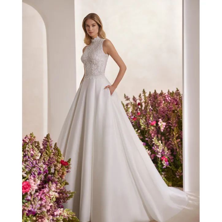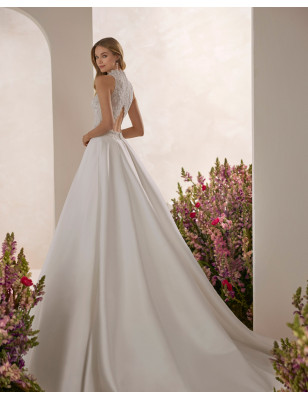 La collezione di Rosa Clará si caratterizza per la sua eleganza e raffinatezza grazie ad abiti in crêpe con volant scultorei. Per aggiungere un tocco di romanticismo, il marchio combina fiori nello stesso tessuto di crêpe dell'abito con altri in organza, per creare composizioni delicate che decorano scollature e spalle.